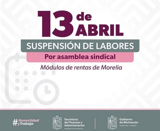 Morelia, Michoacán, 13 de abril de 2023.- Por asamblea del Sindicato de Trabajadores al Servicio del Poder Ejecutivo de Michoacán (STASPE), este jueves no abrieron los módulos y las ventanillas de Recaudación de la Secretaría de Finanzas y Administración (SFA), establecidos en Morelia, motivo por el que la atención y el servicio al público se reanudarán el día viernes.