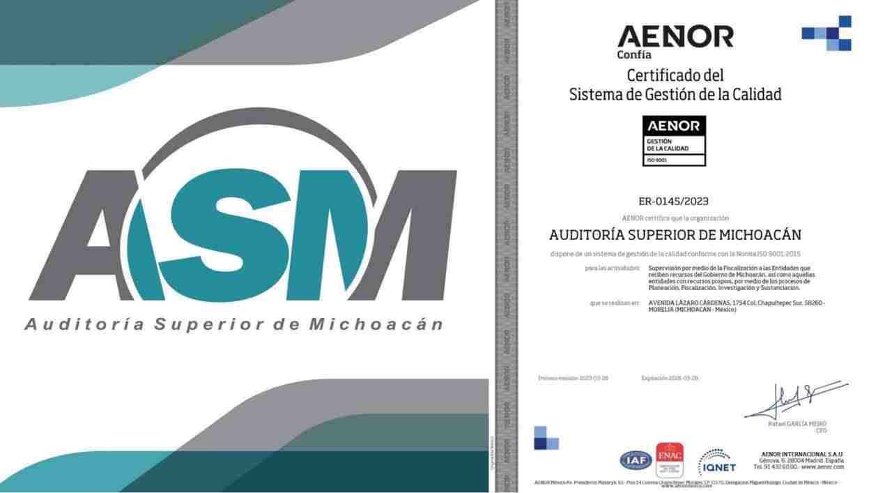 Morelia, Mich; 24 de abril del 2023.- La Auditoría Superior de Michoacán (ASM), logró la certificación en Sistema de Gestión de Calidad ISO 9001:2015 con la casa certificadora AENOR.