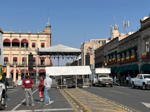 Morelia, Mich; 18 de mayo del 2023.-El primer cuadro de la ciudad fue cerrado y vallado para el gran espectáculo musical de esta noche.