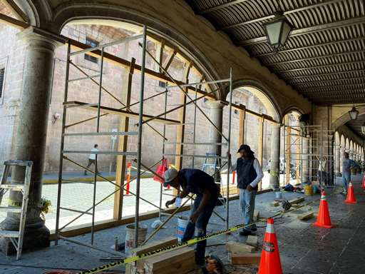 Es así que tras la petición del INAH y en beneficio de la ciudadanía el equipo de la Gerencia del Centro Histórico, ejecutó la acción de colocar provisionalmente puntales de madera para sostener la estructura de los arcos del Portal Allende.
