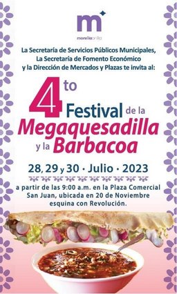 Morelia, Mich; 25 de julio del 2023.-Con gran sabor y una variedad de guisados, del 28 al 30 de julio a partir de las 9:00 horas, la Plaza de San Juan los espera para celebrar su Cuarto Festival de la Megaquesadilla y la Barbacoa.