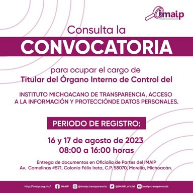 Por unanimidad, dentro de la 29a. Sesión Extraordinaria del IMAIP, los comisionados autorizaron la convocatoria, así como un cronograma del procedimiento de evaluación en el que se pretende que la Secretaría de Contraloría del Estado de Michoacán participe elaborando los reactivos y evaluaciones a las que se someterán los aspirantes a este cargo; con lo que se garantiza un procedimiento imparcial y transparente.