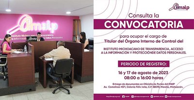 Morelia, Michoacán; a jueves 10 de agosto de 2023.-El Pleno del Instituto Michoacano de Transparencia, Acceso a la Información y Protección de Datos Personales (IMAIP) aprobó la convocatoria para seleccionar a cinco mejores perfiles y ocupar el cargo de Titular del Órgano Interno de Control de este Instituto, con la finalidad de ser propuesto al Congreso del Estado, donde se hará dicho nombramiento.