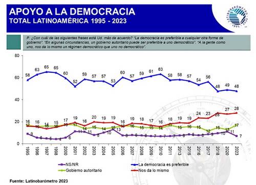 El Informe de Latinobarómetro 2023 denominado “La recesión democrática en América Latina”, el cual se realiza en diferentes períodos para consultarle a la ciudadanía de 18 países del continente, su opinión respecto de la democracia. Por lo que considero importante hacer referencia de este documento, aunado a que se han realizado elecciones primarias y/o de segunda vuelta en varios de estos países.