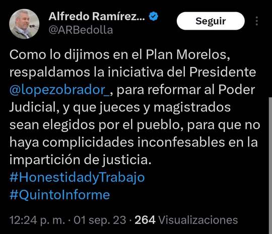 “Como lo dijimos en el Plan Morelos, respaldamos la iniciativa del Presidente Andrés Manuel López Obrador, para reformar al Poder Judicial y que jueces y magistrados sean elegidos por el pueblo, para que no haya complicidades inconfesables en la impartición de justicia”, publicó en redes sociales.