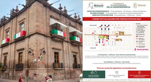 Morelia, Michoacán, 14 de septiembre de 2023.-Con motivo de las fiestas patrias, a partir de las 22:00 horas de este jueves 14 de septiembre, se habilitarán siete accesos para ingresar al Primer cuadro del Centro Histórico de Morelia, a efecto de preservar la seguridad de la población que asiste a los festejos.
