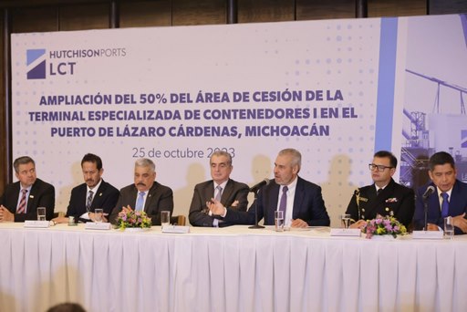 Ciudad de México, 26 de octubre de 2023.- El gobernador Alfredo Ramírez Bedolla y la trasnacional Hutchinson Ports LCT, anunciaron una inversión superior a los 220 millones de dólares (más de 4 mil millones de pesos), para la ampliación de la terminal especializada de contenedores del puerto de Lázaro Cárdenas.