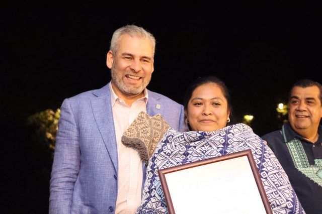 Pátzcuaro, Michoacán, 2 de noviembre de 2023.- Con un huanengo con grecas hecho en telar de cintura, la maestra artesana Cecilia Sosa Nico, de la localidad de Angahuan, en el municipio de Uruapan, se convirtió en la ganadora del máximo galardón del 54 Concurso Estatal de Artesanías en Pátzcuaro, celebrado en el marco de la tradicional Noche de Muertos.