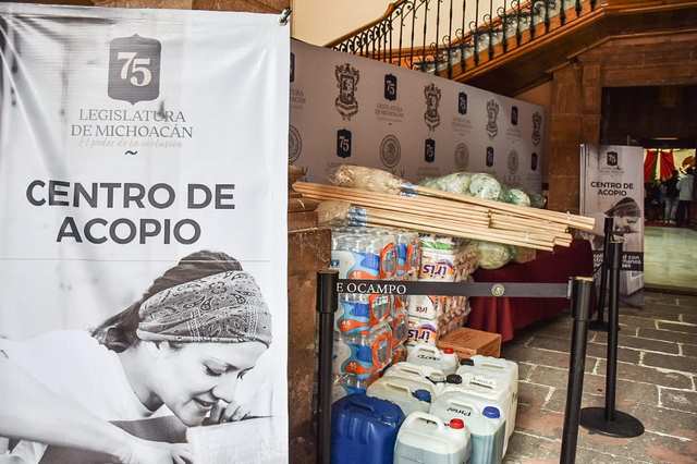 Morelia, Michoacán, a 10 de noviembre de 2023.- Frente a la situación que viven miles de familias del estado de Guerrero, tras el embate del huracán Otis, la 75 Legislatura de Michoacán instaló un Centro de Acopio de víveres, en la sede el Palacio Legislativo.