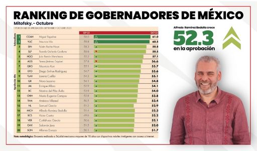 De acuerdo a la encuestadora, los 23 gobernadores afines a la Cuarta Transformación, durante octubre tuvieron un crecimiento de 0.5 puntos.