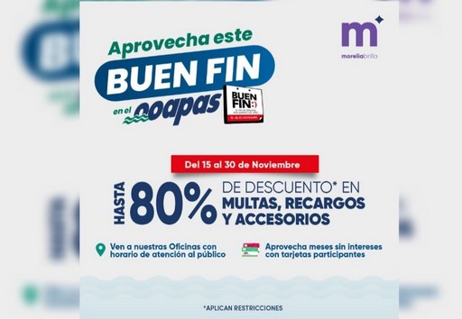 Morelia, Mich; 14 de noviembre del 2023.-A partir de mañana y hasta el 30 de este mes, el Organismo Operador de Agua Potable, Alcantarillado y Saneamiento (OOAPAS) ofrece descuentos de hasta 80 por ciento en multas, recargos y accesorios.