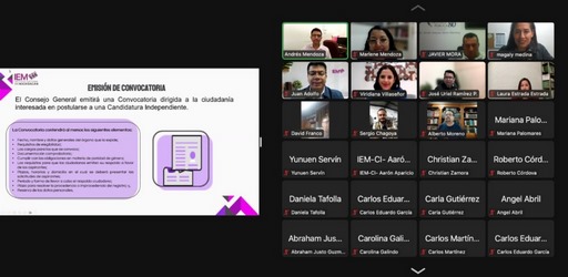 Morelia, Michoacán.-Con el objetivo de brindar una orientación a todas las personas que aspiran a una candidatura independiente y puedan cumplir con los requisitos legales, registrales, notariales y hacendarias con el fin de postularse al cargo de diputaciones de mayoría relativa y/o ayuntamientos (presidencias municipales, regidurías y sindicaturas) para el proceso electoral ordinario local 2023-2024, esta tarde Consejerías y Personal de diversas áreas del Instituto Electoral de Michoacán (IEM), impartieron una capacitación en modalidad virtual.