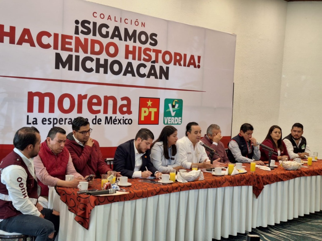 En conferencia de prensa, los dirigentes de los tres partidos: Juan Pablo Celis Silva (MORENA), Reginaldo Sandoval Flores (PT) y Ernesto Núñez Aguilar (PVEM), acompañados de los precandidatos al Senado de la República: Reyna Celeste Ascencio Ortega y Raúl Morón Orozco, auguran un triunfo contundente de la 4T gracias a la coalición, tanto en Michoacán como en el resto de la República.