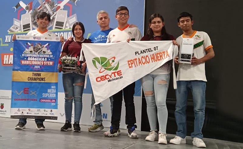 Chihuahua, Chihuahua, 21 de enero de 2024.- Con pase al mundial de Robótica y campeones nacionales en Programacion, los estudiantes del Colegio de Estudios Científicos y Tecnológicos del Estado de Michoacán (Cecytem), se subieron al podium tras haber participado en el Campeonato Nacional de Robótica y Habilidades STEM 2024, celebrado en Chihuahua.