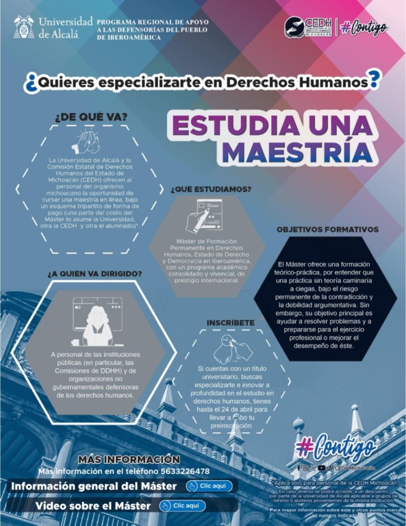 Para mayores informes ingresar a las páginas web cedhmichoacan.org y/o uah.es/es/