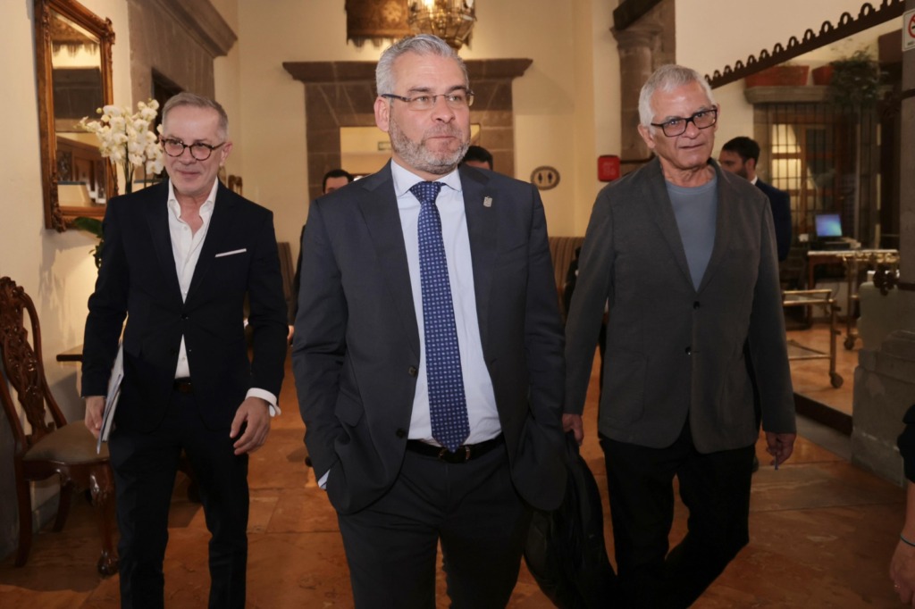 Ciudad de México, 28 de febrero de 2024.-El gobernador Alfredo Ramírez Bedolla y directivos de Doppelmayr y Grupo Indi informaron avances del proceso de fabricación y construcción del cablebús o teleférico en Uruapan.