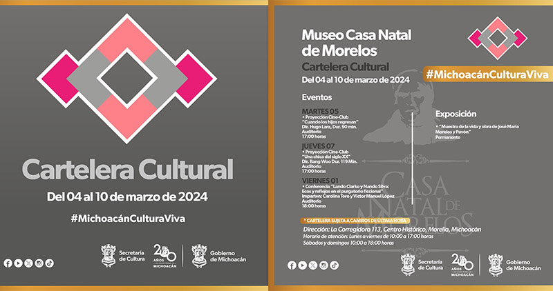 Morelia, Michoacán, 4 de marzo de 2024.-No te pierdas de una semana cultural en Michoacán del 4 al 10 de marzo. Habrá nuevas exposiciones, talleres, conversatorios, conferencias, proyecciones de cine y eventos especiales para conmemorar el Día Internacional de la Mujer.
