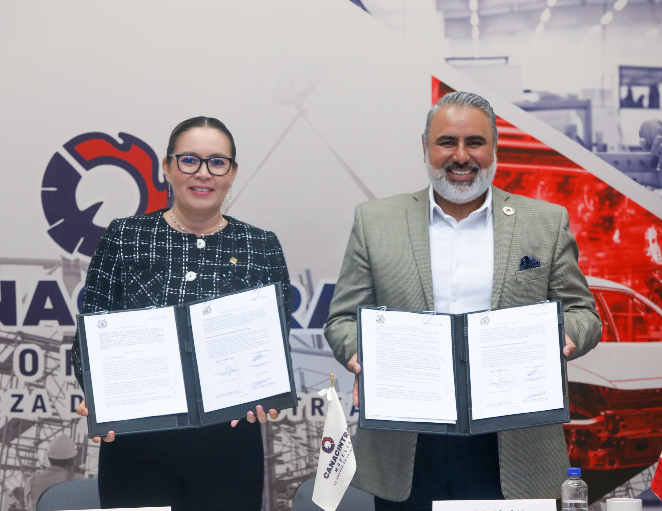 * La rectora de la UMSNH, Yarabí Ávila y el presidente de la Canacintra delegación Morelia, Aramis Sosa, firman convenio de colaboración en materia de prácticas profesionales.