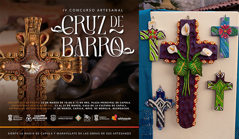 Morelia, Michoacán, 22 de marzo de 2024.- Esta Semana Santa, si estás en Morelia, tienes una gran opción para visitar, ya que en la tenencia de Capula se realizará la cuarta edición del Concurso Artesanal Cruz de Barro, que tendrá en venta y exposición sus piezas ganadoras y participantes del 22 al 31 de marzo en la Casa de la Cultura del lugar.
