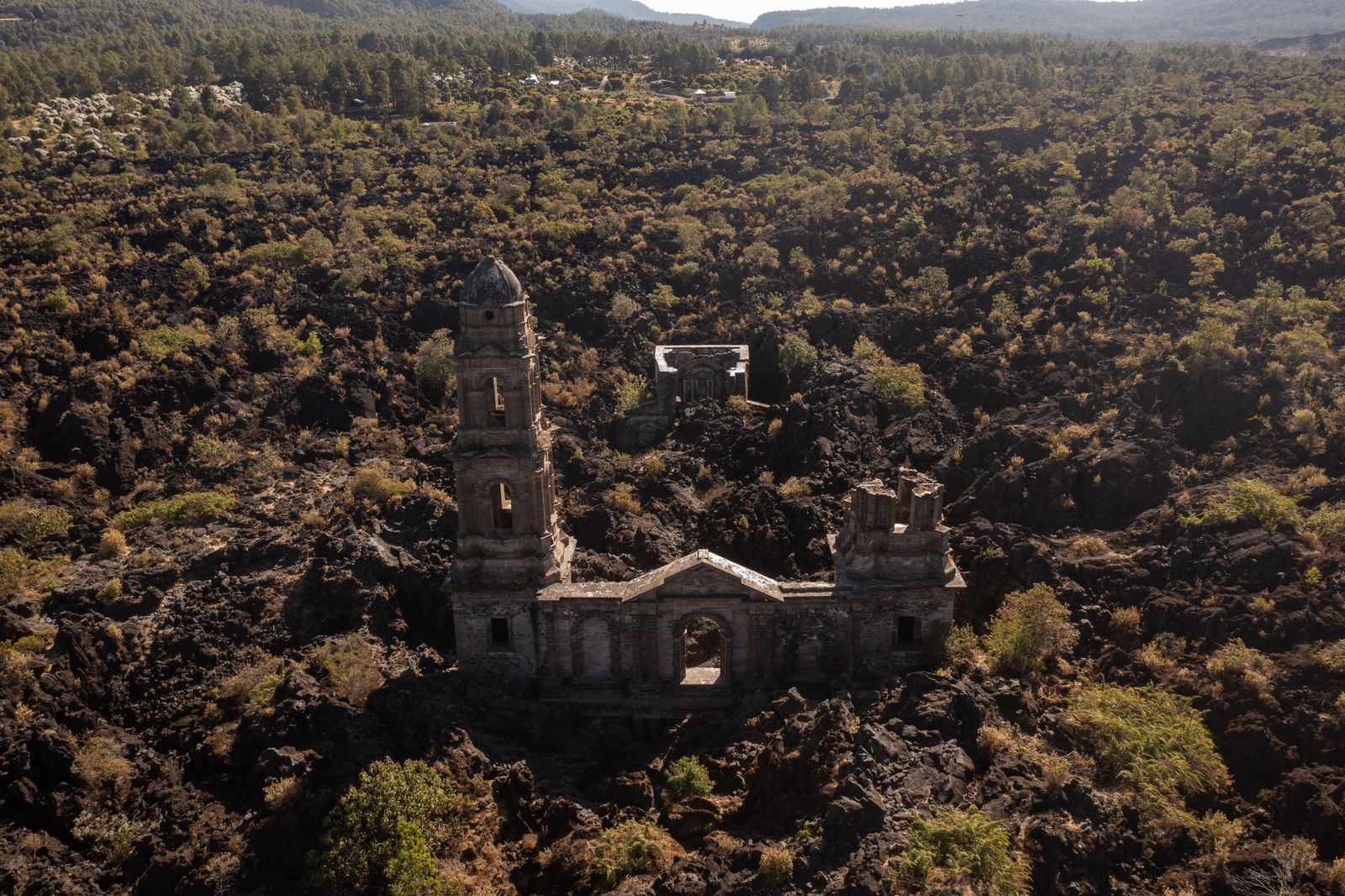 Desde el mirador que se localiza en los bosques que bordean al volcán, se aprecian los más de 20 kilómetros cuadrados cubiertos por la roca que en su momento fuera el río de lava que arrojó el coloso, sepultando los pueblos Paricutín y la mayor parte de San Juan Parangaricutiro.