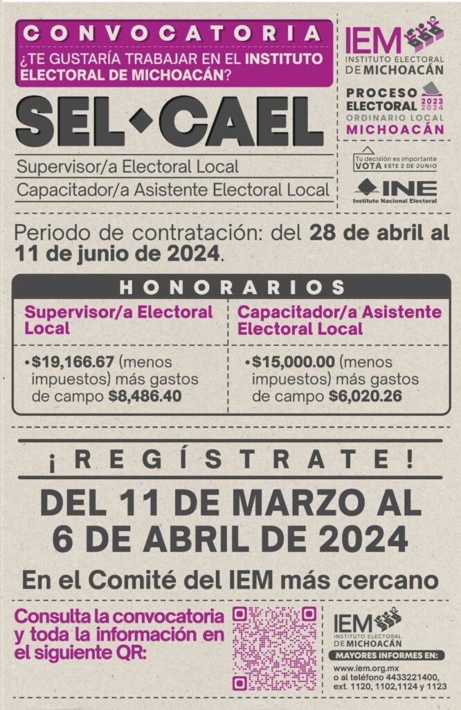 “Los empleos son el todo Michoacán, por lo que si eres interesado consulta la página oficial del órgano, ya que las inscripciones son desde el 11 de marzo hasta el 6 de abril”, explicó.