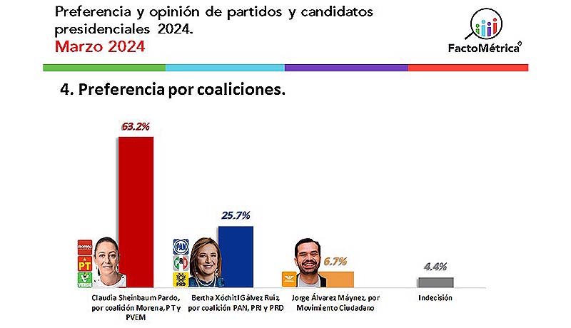 Más aún, la mitad del 53 por ciento que sí contestó la encuesta, dice no haber definido su voto o que podría variarlo a la hora de votar, lo cual podría significar un porcentaje adicional en favor de Xóchitl Gálvez.