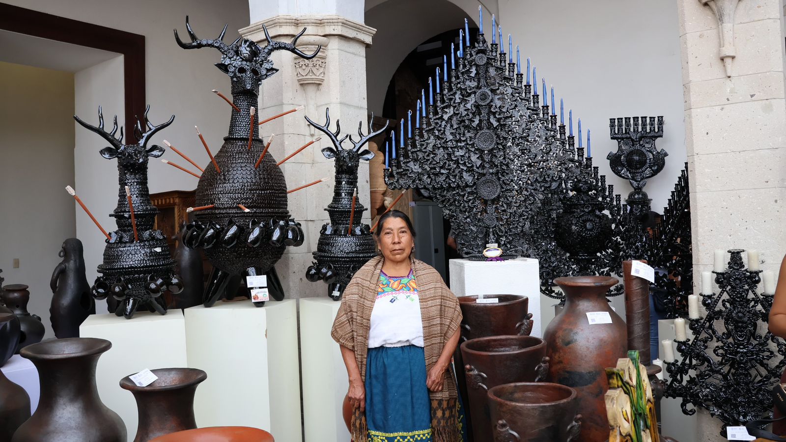 Uruapan, Michoacán, 27 de marzo de 2024.- La maestra artesana Esperanza Ceja Ramos, de la localidad de Santa Fe de la Laguna, en el municipio de Quiroga, ganó el galardón Victoriano Salgado Morales, en la rama de alfarería vidriada sin plomo con un candelabro de 25 velas en el LXIII Concurso Estatal de Artesanías con motivo del Domingo de Ramos en Uruapan.