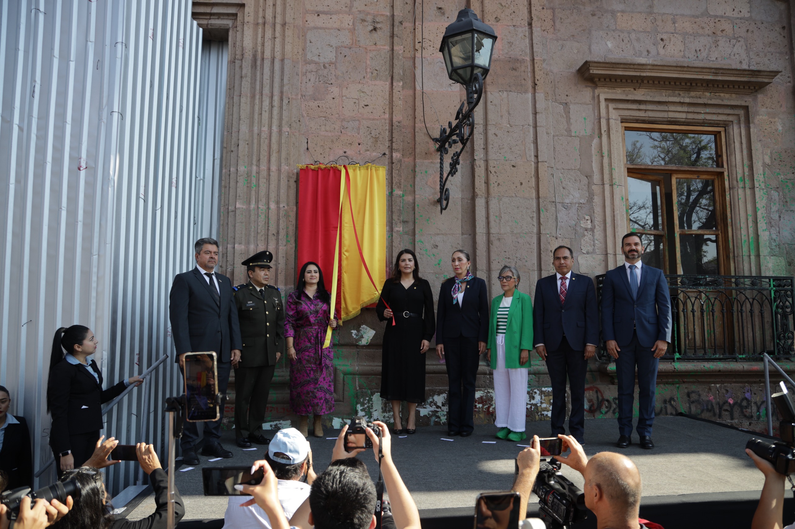 Morelia, Michoacán; 30 de abril de 2024.- Con el objetivo de dar a conocer las actividades artísticas, culturales y turísticas que se realizarán por el 483 Aniversario de la fundación de Morelia, el Ayuntamiento en conjunto con autoridades estatales y militares, así como ciudadanía en general, realizó el recorrido en Bando Solemne para develar el programa en los 8 estrados municipales del centro histórico.
