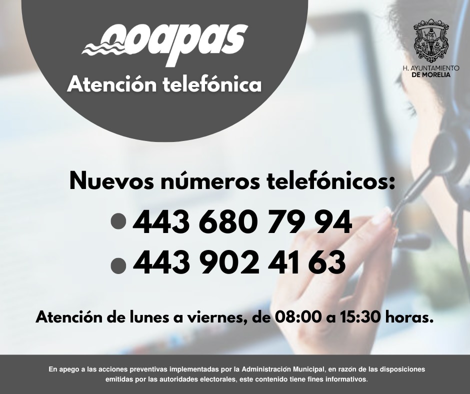 Morelia, Michoacán, a 03 de mayo de 2024.-El Organismo Operador de Agua Potable, Alcantarillado y Saneamiento (OOAPAS) informa que a partir de hoy quedan activos dos nuevos números telefónicos, para que los usuarios puedan llamar y hacer sus reportes.