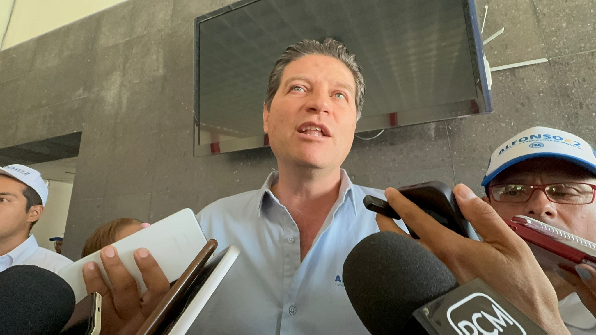 Morelia, Michoacán; 9 de mayo del 2024.-Alfonso Martínez Alcázar, candidato a presidente municipal de Morelia, aseguró que no se trata de una elección de tres partidos, que no está compitiendo ni con Morena ni el PRI.