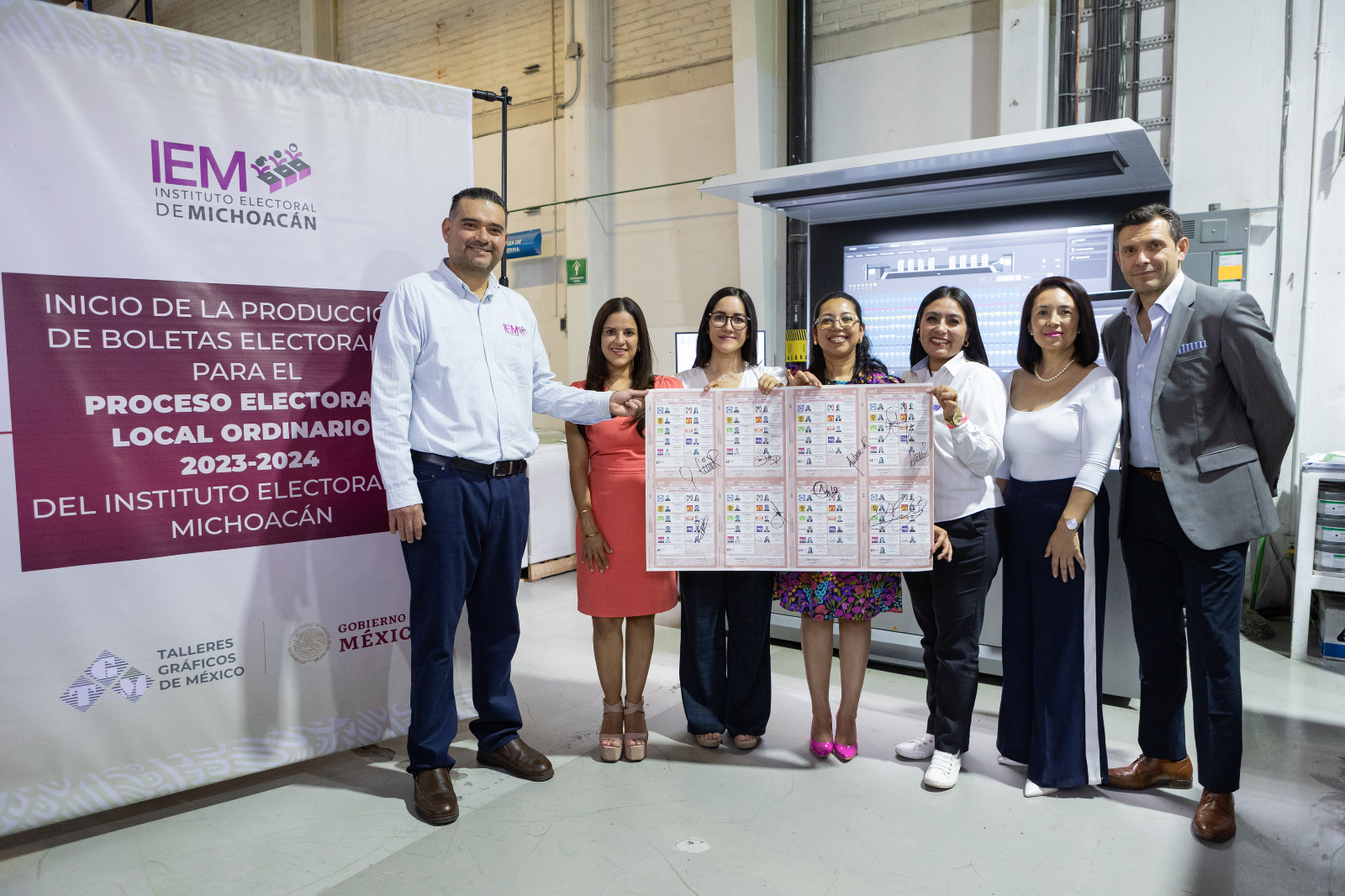 Morelia, Michoacán a 07 de mayo de 2024.-Consejerías del Instituto Electoral de Michoacán (IEM) asistieron al inicio del proceso de impresión de boletas electorales y material electoral que se utilizarán el domingo 2 de junio, cuando se elija al Poder Legislativo y a 112 Ayuntamientos en las elecciones locales.