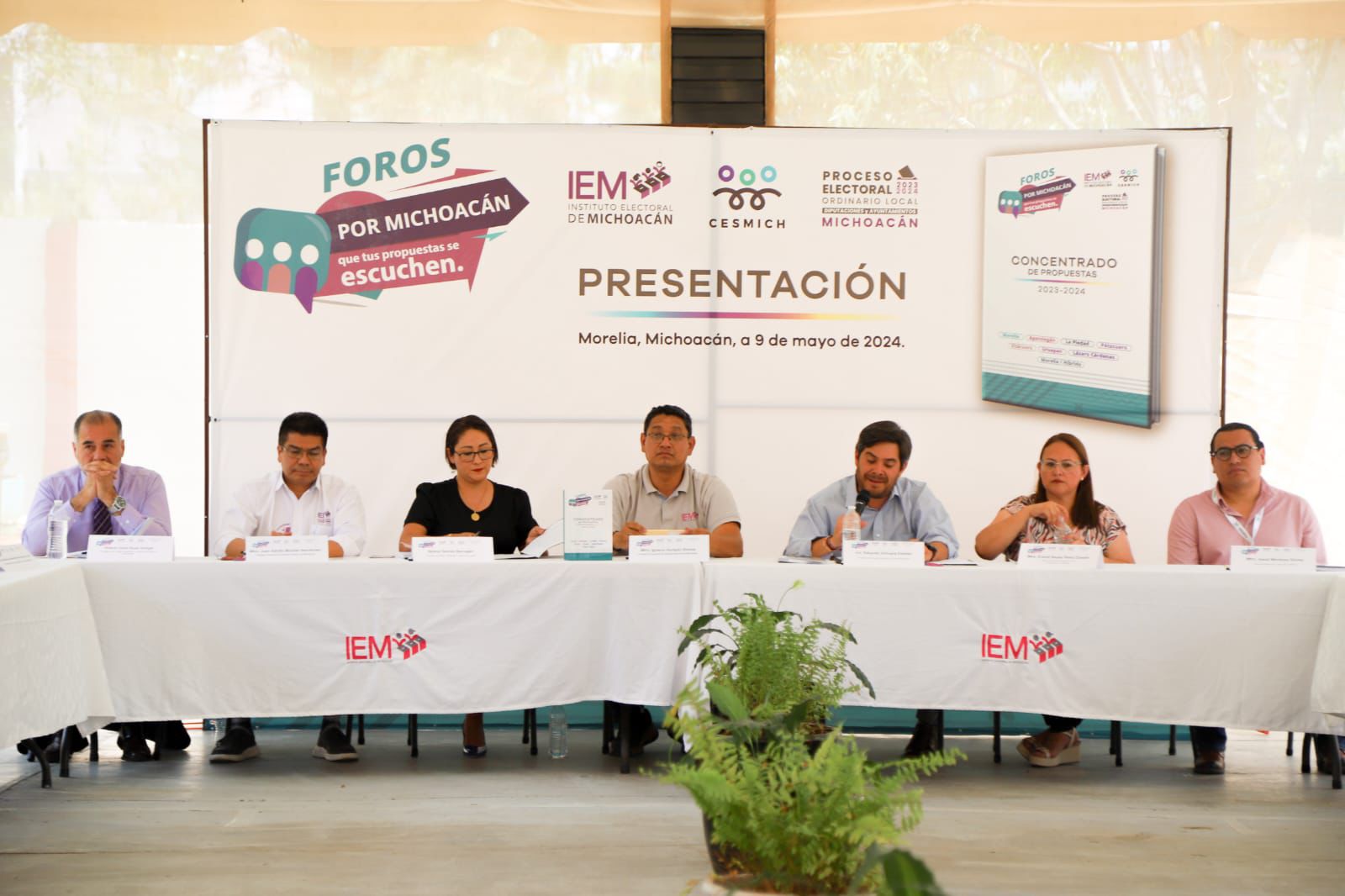Morelia, Michoacán, 09 de mayo 2024.- El Instituto Electoral de Michoacán y el Consejo Económico y Social de Michoacán, presentaron el libro denominado Concentrado de Propuestas. Se trata de un ejercicio inédito que llevaron en coordinación para que la sociedad civil presentara sus propuestas sobre las necesidades que tiene y así, las candidaturas a los diferentes puestos de elección popular puedan integrarlas a sus plataformas.