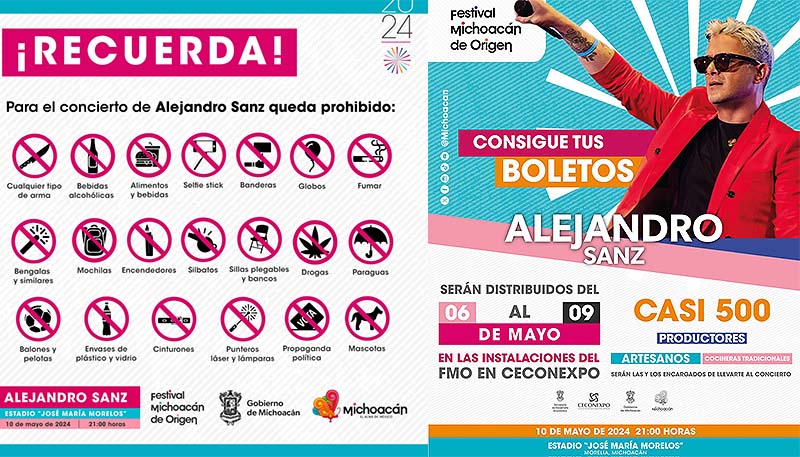 Morelia, Michoacán, 9 de mayo de 2024.- Faltan solo unas horas para el concierto de Alejandro Sanz en Morelia, como parte de la celebración por el Día de las Madres del Festival Michoacán de Origen; para que disfrutes en un ambiente seguro y 100 por ciento familiar, te dejamos las siguientes recomendaciones.