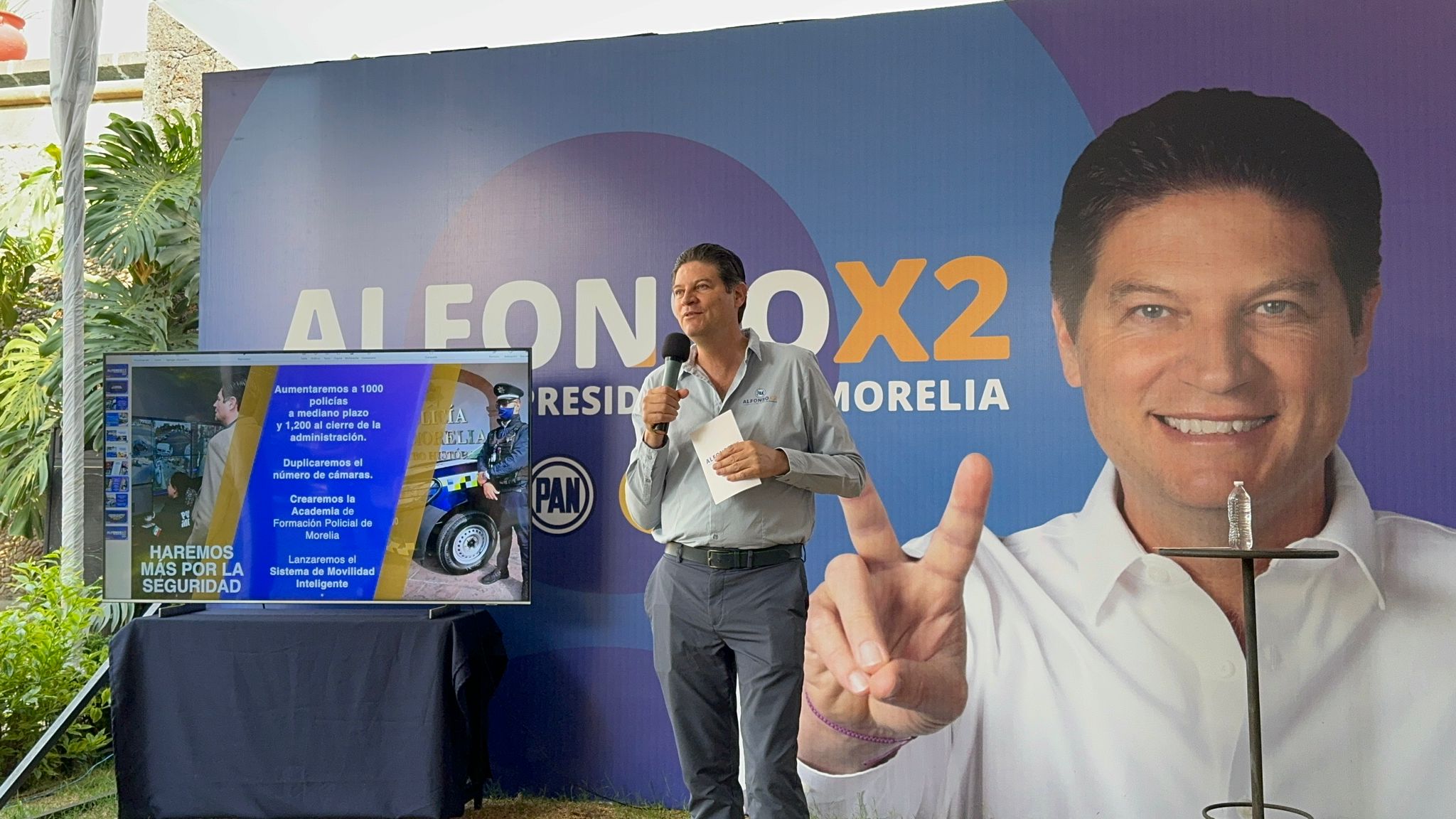 Morelia, Michoacán; 13 de mayo del 2024.-El candidato de la alianza PAN-PRD a la presidencia municipal de Morelia, Alfonso Martínez Alcázar, dio a conocer su cuarta propuesta que es la Seguridad.