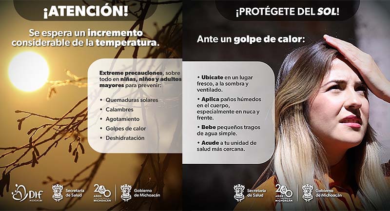 Morelia, Michoacán, 20 de mayo de 2024.- Ante la tercera ola de calor que registrará temperaturas por arriba de los 45 grados Celsius, la Secretaría de Salud de Michoacán (SSM) alerta a la población a prevenir los daños asociados como quemaduras solares, calambres, agotamiento y golpes de calor.