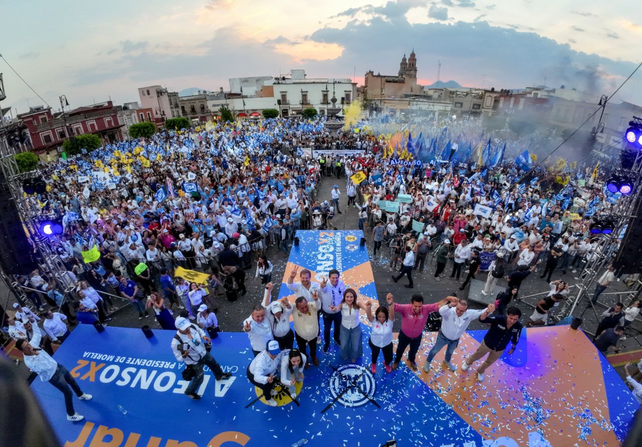Morelia, Michoacán; 25 de mayo de 2024.- Alfonso Martínez Alcázar cerró de forma espectacular su campaña, al reunir a más de 20 mil morelianas y morelianos en una Plaza Valladolid que lució chica por la gran convocatoria.