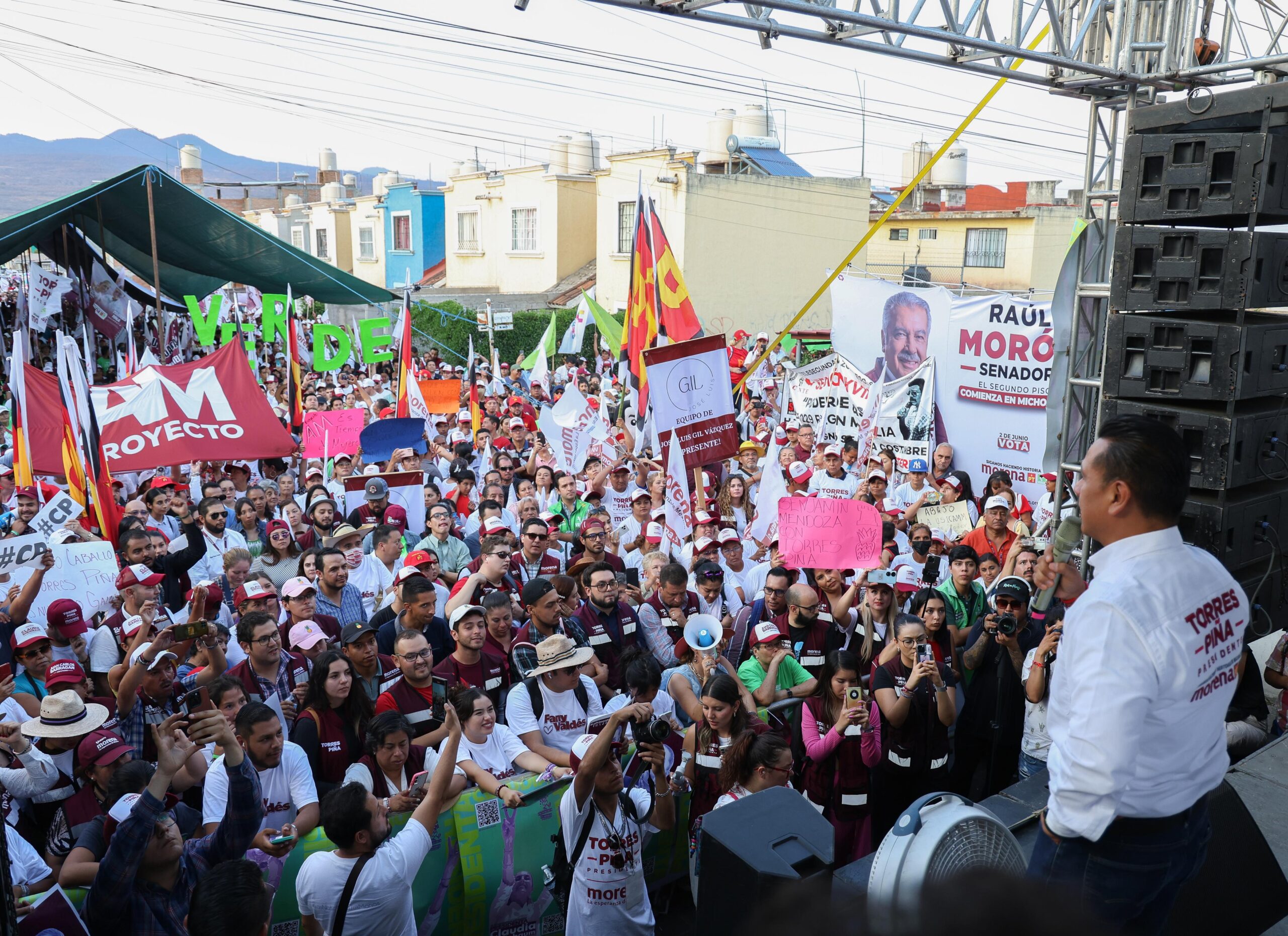 Morelia, Michoacán.-En su tercer cierre de campaña, el candidato a la presidencia de Morelia por la coalición Sigamos Haciendo Historia, Carlos Torres Piña, fue recibido por más de 8 mil simpatizantes de la 4T, donde el poderío territorial que lo acompaña salió a relucir, esto de cara a la elección del próximo 2 de junio.