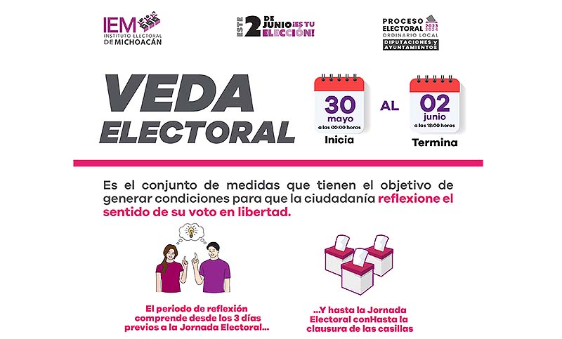 Morelia, Michoacán a 30 de mayo de 2024. Con la finalidad de generar condiciones para que los ciudadanos se tomen el tiempo de reflexionar sobre el voto que ejercerán en libertad el próximo 2 de junio la normativa electoral señala una serie de medidas denominadas “Veda Electoral”.
