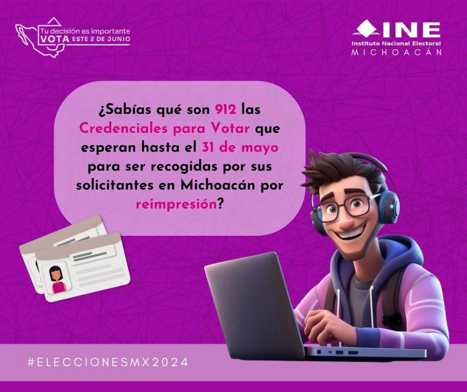Morelia, Michoacán; 31 de mayo del 2024.- Hoy hasta las 9 de la noche, es el plazo para quienes tramitaron su credencia para votar por reimpresión donde fue solicitada.