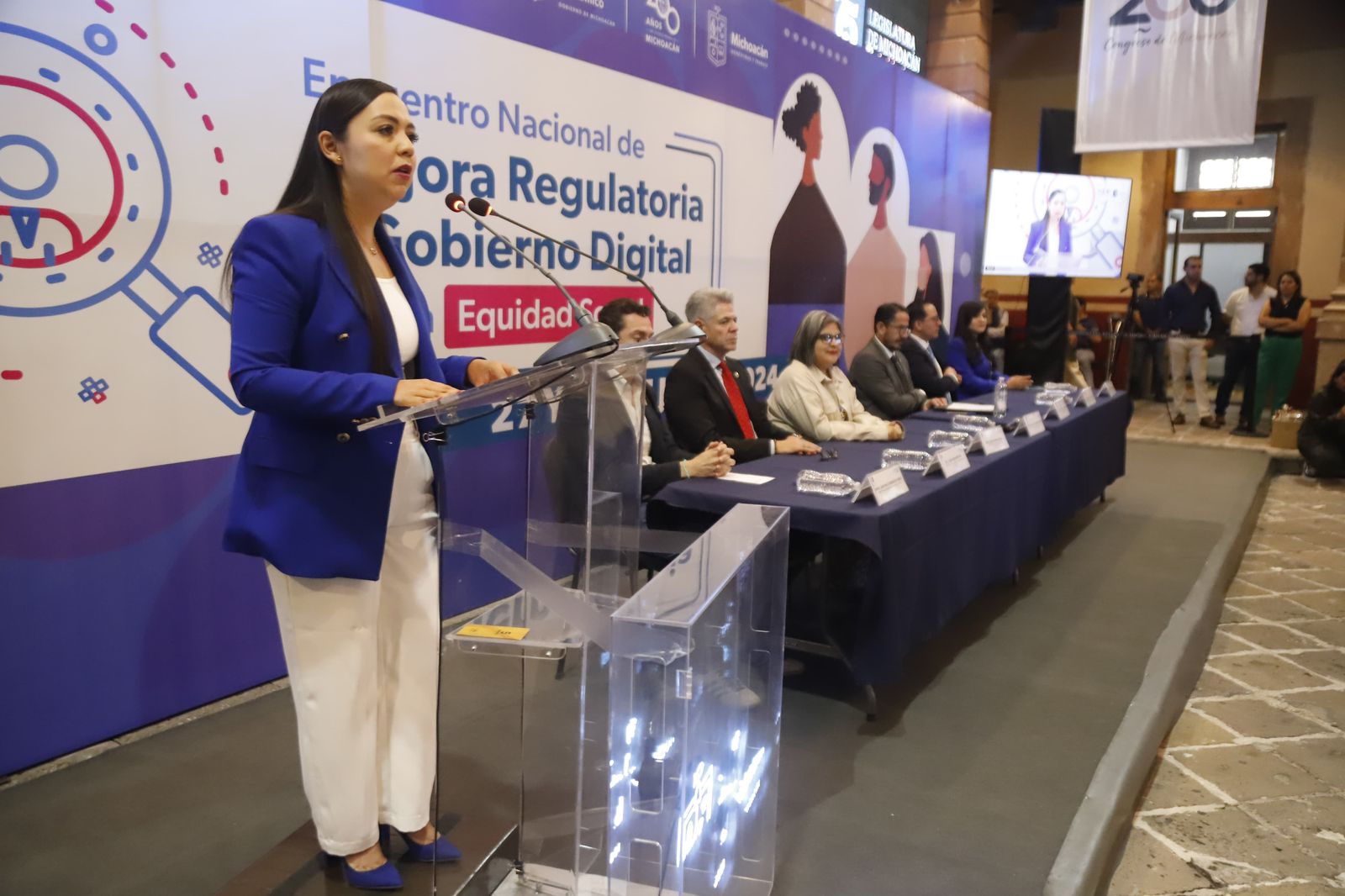 Morelia, Michoacán, a 27 de junio de 2024.- Bajo la premisa de que la mejora regulatoria y la implementación de tecnologías digitales son pilares en la construcción de un México más justo y equitativo, la diputada Liz Alejandra Hernández Morales, ofreció la bienvenida a quienes participan en el Encuentro Nacional de Mejora Regulatoria y Gobierno Digital para la Equidad Social, que se desarrolla en la sede del Poder Legislativo.