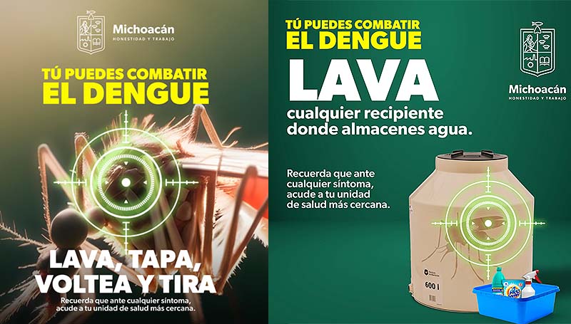 Morelia, Michoacán, 1 de julio de 2024.- La Secretaría de Salud de Michoacán (SSM) recuerda a la población mantener en el hogar la estrategia lava, tapa, voltea y tira todo aquello que acumule agua, con el propósito de evitar la reproducción del mosco Aedes aegypti, transmisor del dengue, zika y chikungunya.