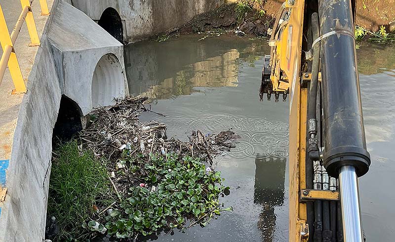 Con maquinaria, se retiraron 7 toneladas de material que se encontraba obstruyendo el paso de agua. La basura hizo presencia otra vez: llantas, bolsas plásticas y botellas PET se acumularon junto con las ramas arrastradas por la corriente del dren.