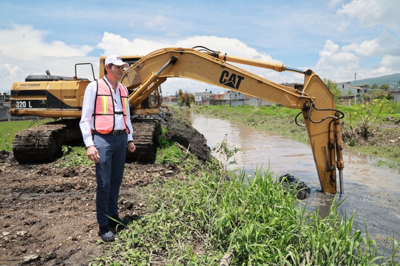 Con la presencia evidente de maquinaria pesada, el Gobierno de Morelia refuerza las labores de prevención en zonas vulnerables a las lluvias con el refuerzo de los bordes del dren Gertrudis Sánchez.