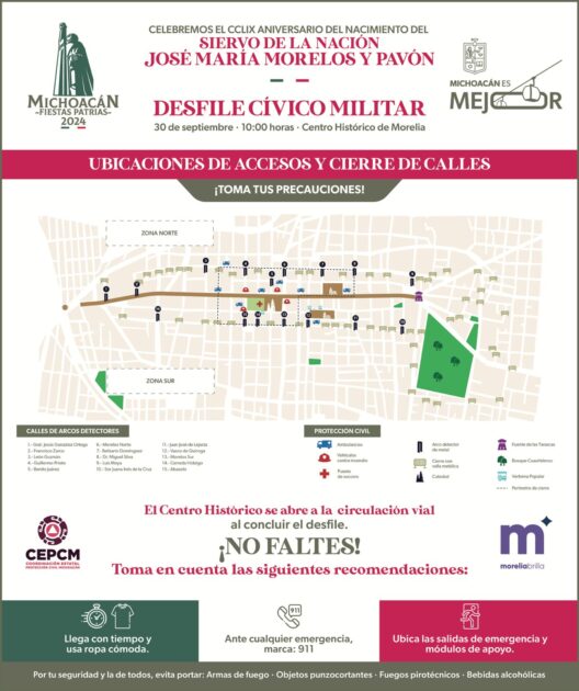 Morelia, Michoacán, 28 de septiembre de 2024.- Con motivo del Desfile Cívico Militar por el 259 aniversario del natalicio de José María Morelos y Pavón, el próximo lunes 30 de septiembre, la Secretaría de Seguridad Pública (SSP) habilita un dispositivo vial mediante 15 accesos controlados y cierres a la circulación vehicular en el Centro de Morelia.