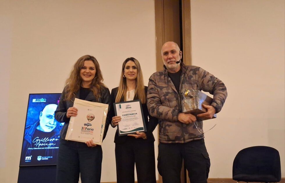 “Queremos agradecerte esta oportunidad que nos has dado a los morelianos; más que cine y literatura, para mí ha sido escuchar valores que tienen que ver con el rigor y la disciplina, es sumamente importante que los jóvenes tengan referentes como tú. Espero que puedas ser amigo de la Feria del Libro”, señaló la Secretaria de Cultura de Morelia, Fátima Chávez Alacaraz, al entregar un reconocimiento al autor.
