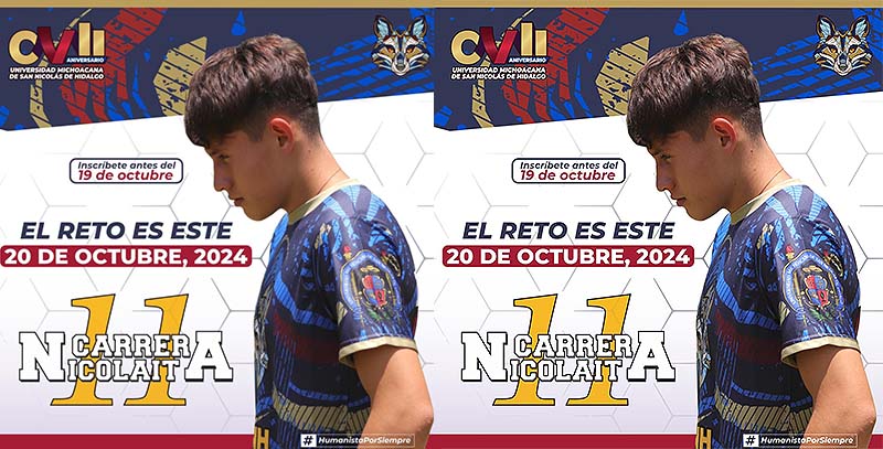Morelia, Michoacán, a 12 de octubre de 2024.- Continúan abiertas las inscripciones para la 11ª Carrera Nicolaita que organiza la Universidad Michoacana de San Nicolás de Hidalgo (UMSNH), un evento deportivo emblemático en la ciudad que se llevará a cabo el próximo domingo 20 de octubre y en el que se espera la participación de alrededor de mil 500 atletas.