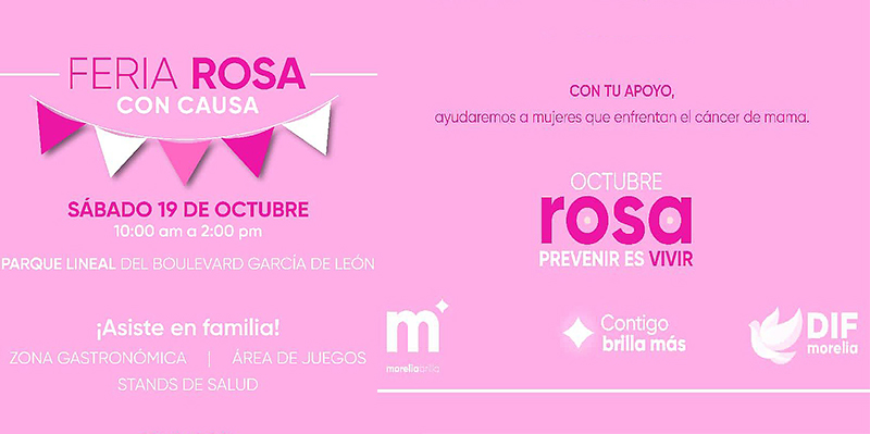 La Presidenta Honoraria del DIF Morelia, Paola Delgadillo Hernández, invita a las familias morelianas a participar en la Feria Rosa con causa, que se llevará a cabo mañana sábado 19 de octubre a partir de las 10:00 a.m. en el Parque Lineal del Boulevard García de León.