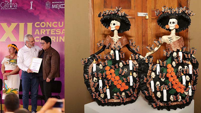 Morelia, Michoacán, 20 de octubre de 2024.- El máximo premio de la edición 12 del Concurso Artesanal de la Catrina de Capula, lo ganó el maestro artesano Juan Carlos de la Cruz Hernández, distinción que lleva el nombre de su papá Álvaro de la Cruz López, uno de los precursores de la elaboración de las catrinas.