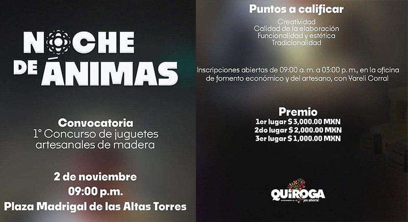Quiroga, Michoacán, a 30 de octubre 2024. – A fin de promover la creatividad y la habilidad artesanal en la elaboración de juguetes hechos a mano, el Gobierno de Quiroga invita a participar al Concurso de Juguetes Artesanales de Madera que se efectuará el próximo 2 de noviembre, en la Plaza Madrigal de las Altas Torres, en punto de las 9:00 a.m.