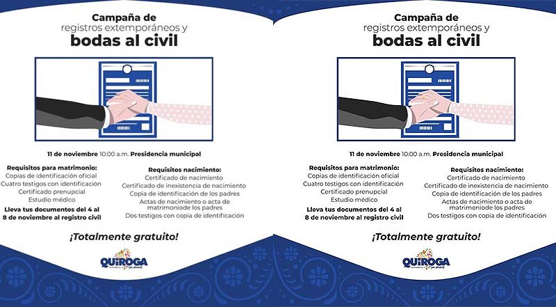 Quiroga, Michoacán, a 5 de noviembre 2024. El Gobierno de Quiroga invita a la ciudadanía a participar en la Campaña de Registros Extemporáneos y Bodas Civiles que se llevará a cabo el 11 de noviembre, a las 10:00 a.m., en las instalaciones del Registro Civil.
